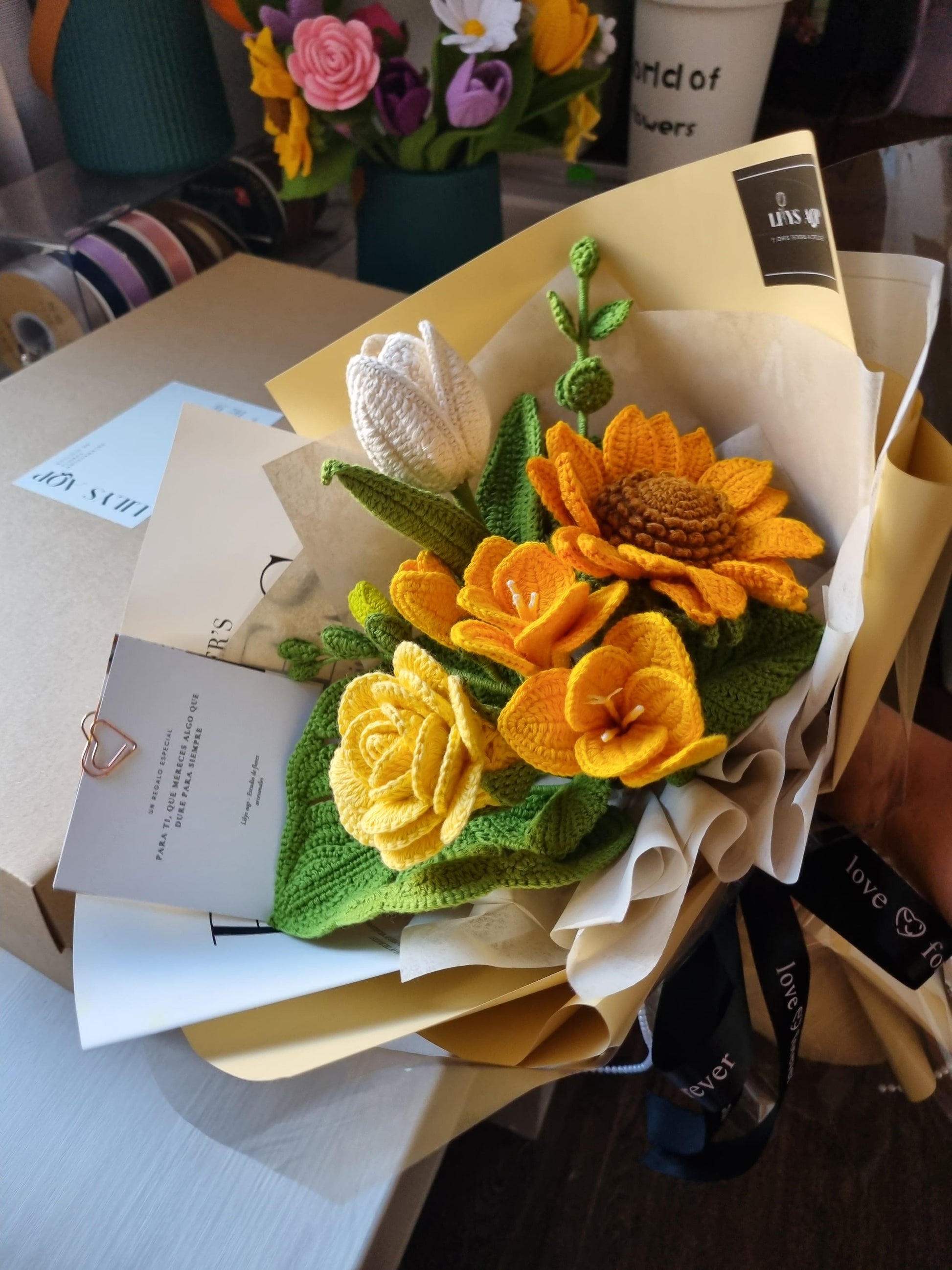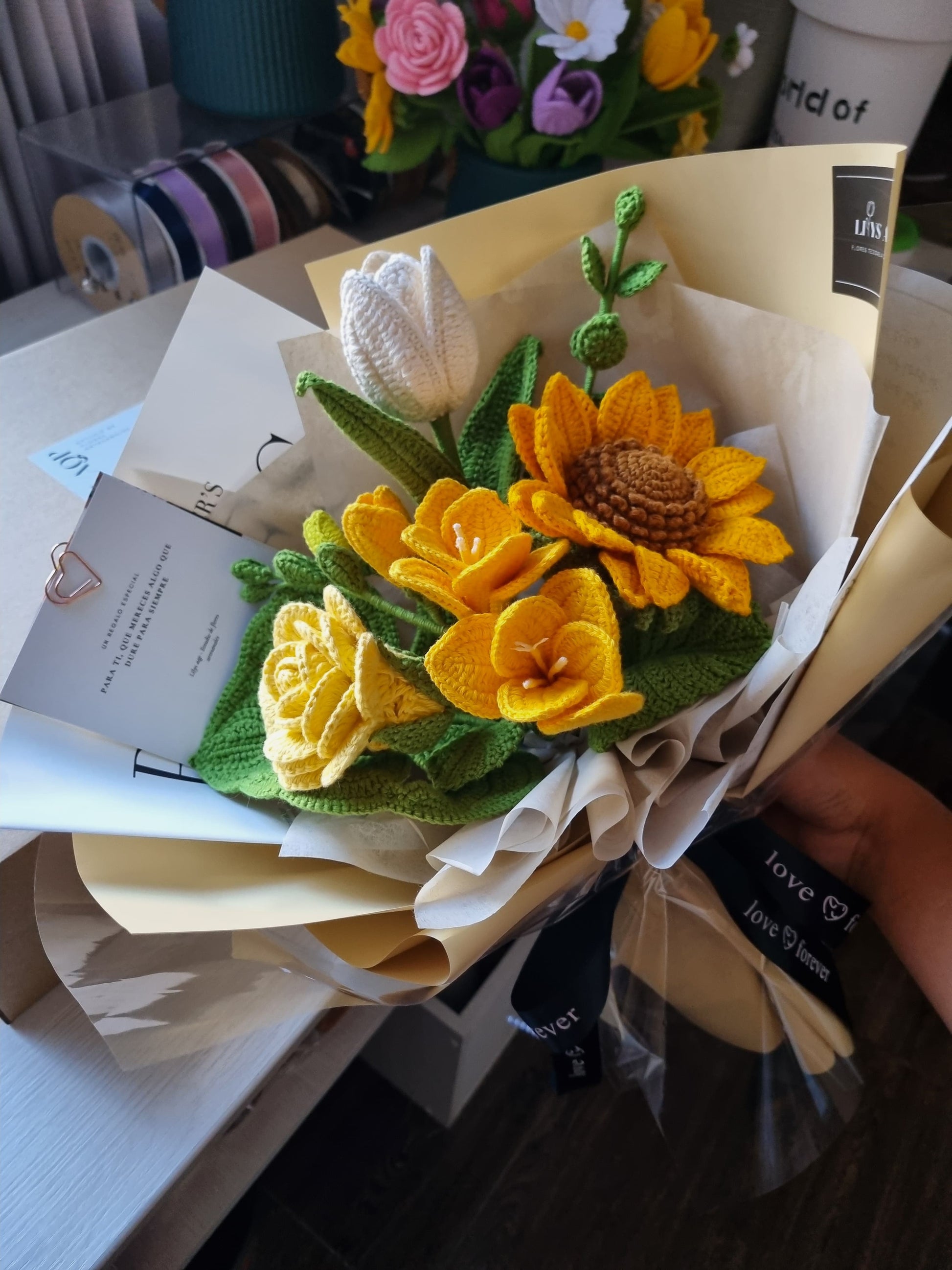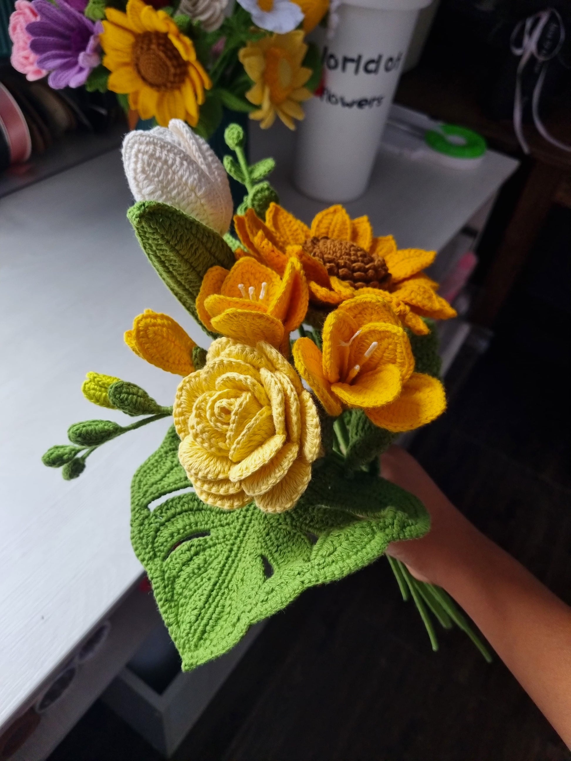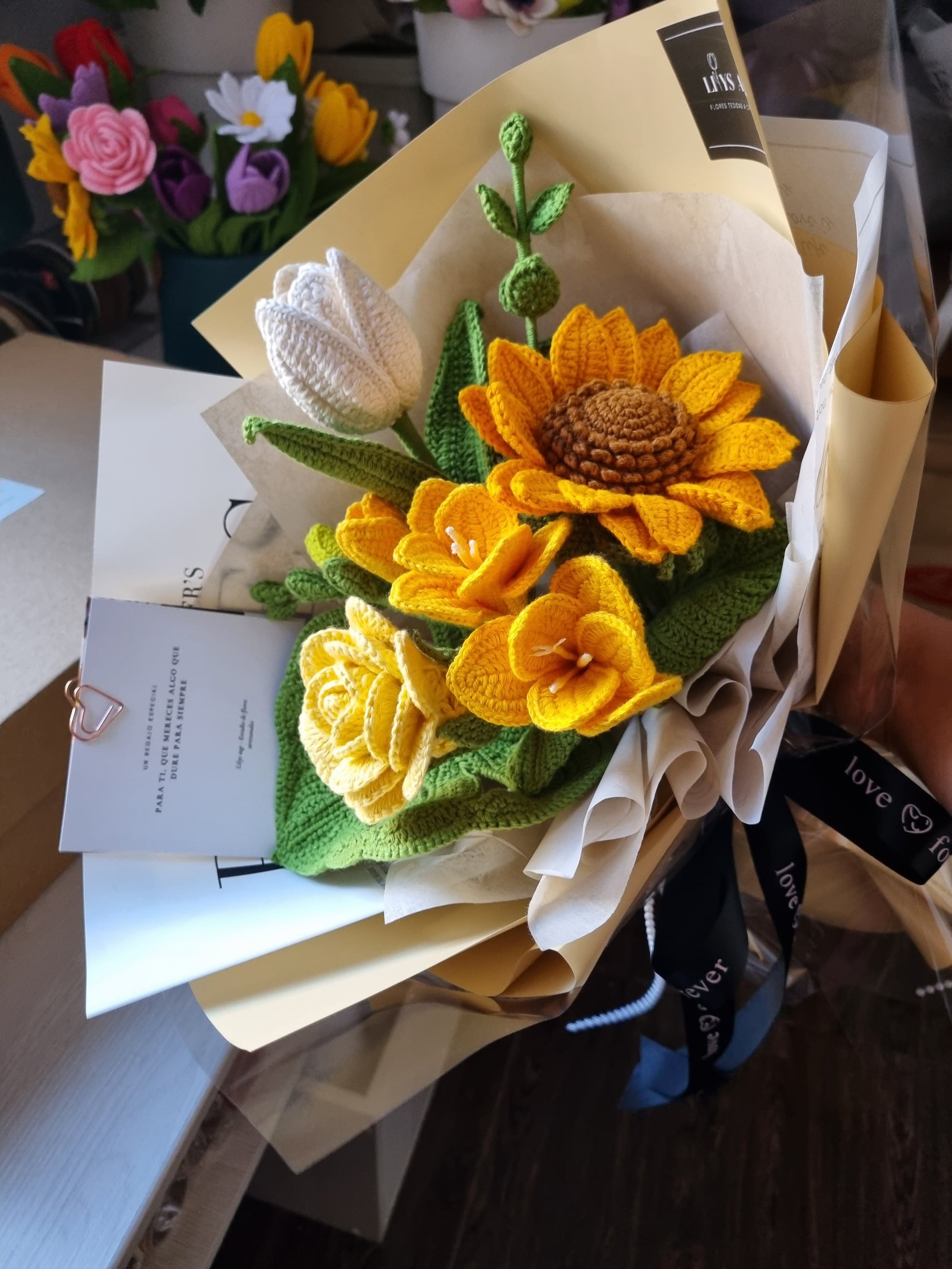 1 tulipan tejido hoja por hoja, 1 rosa, 1 girasol, 1 rama fresia, 1 rama de eucalipto, 1 hoja monstera.