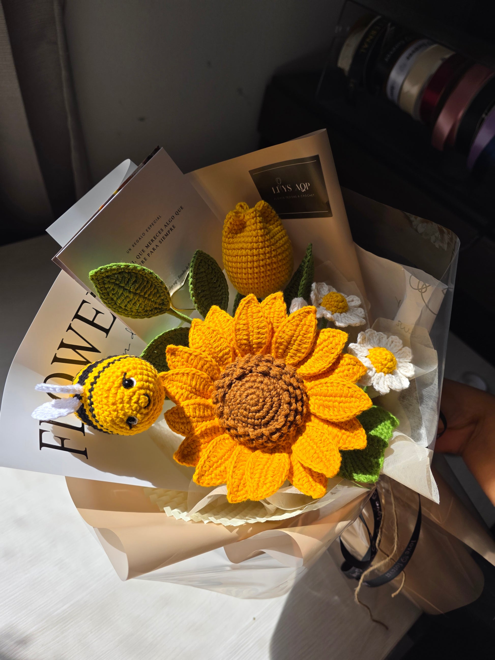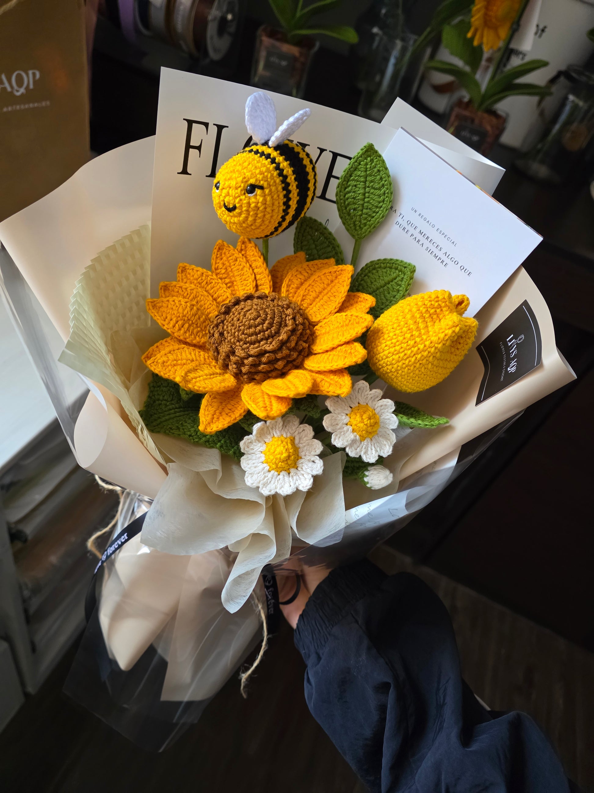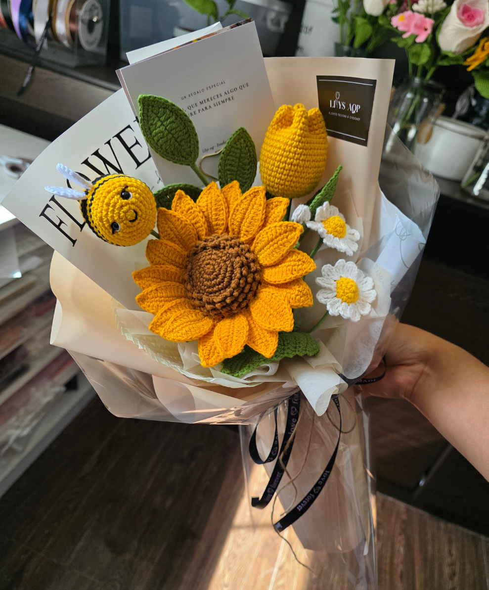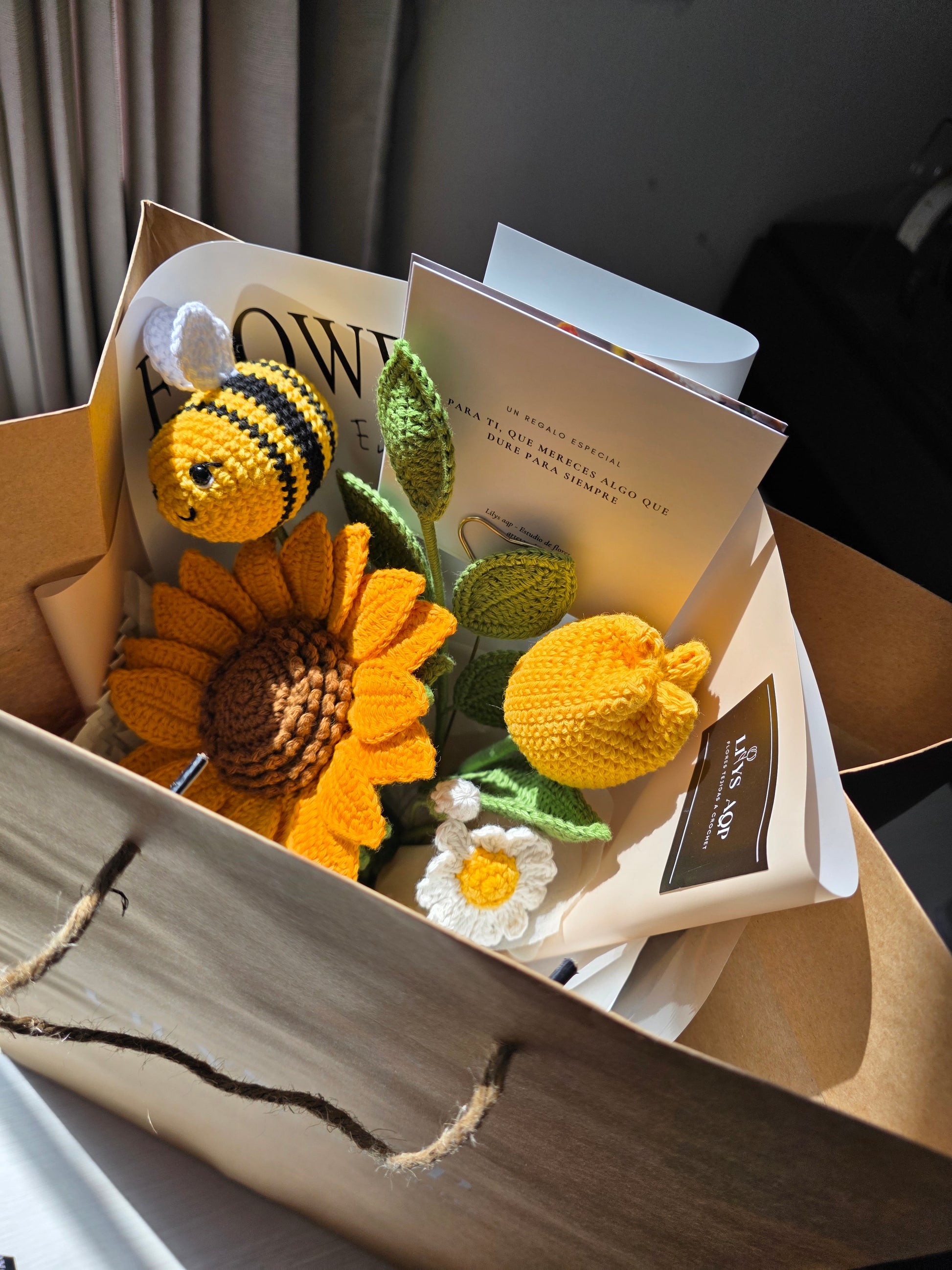 1 girasol, 1 minimargarita, 1 abejita, 1 ramita de hojas, 1 tulipan.