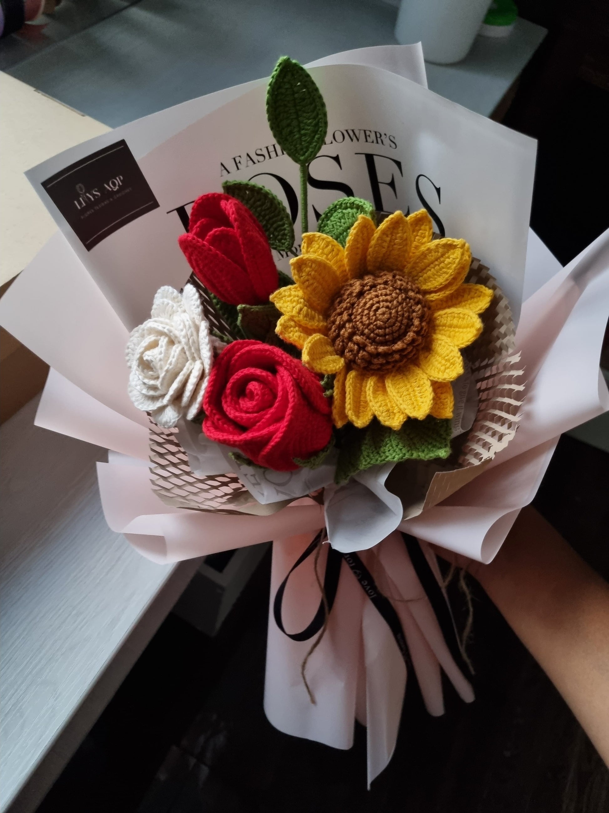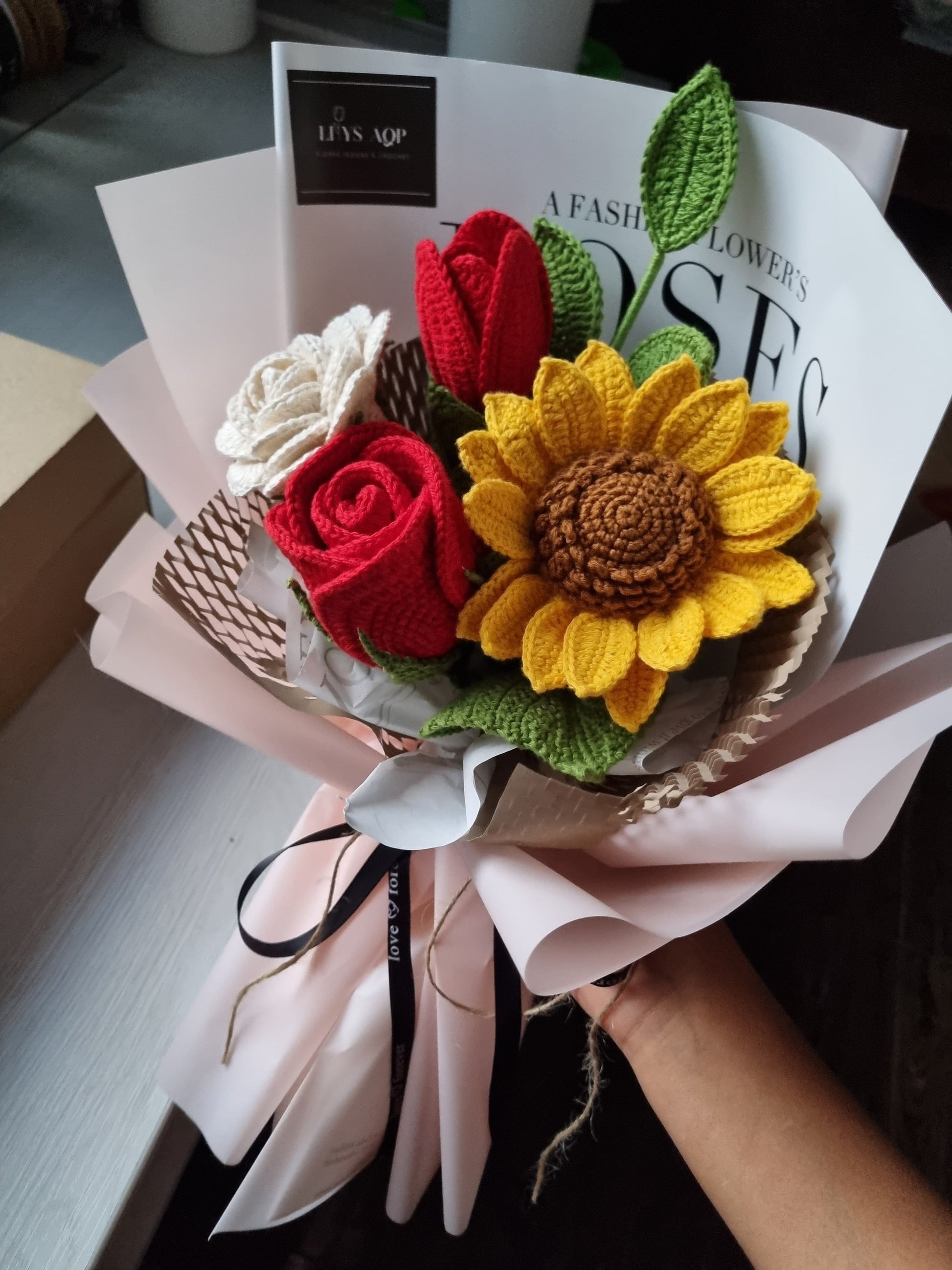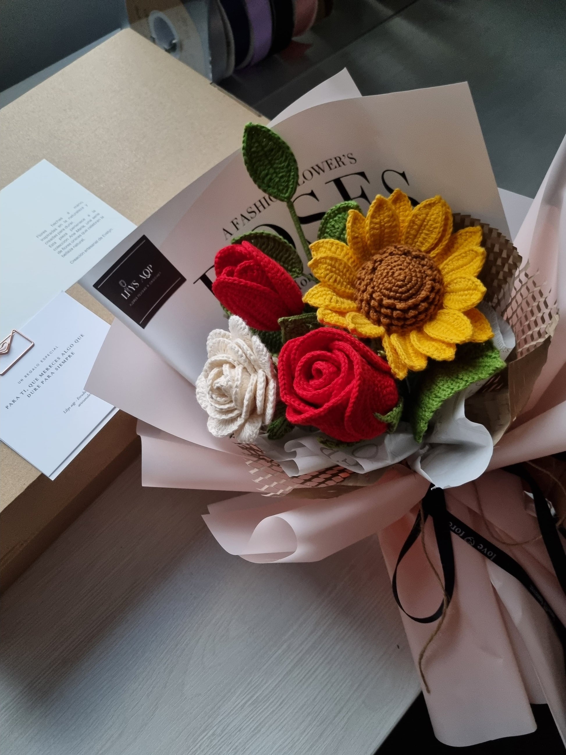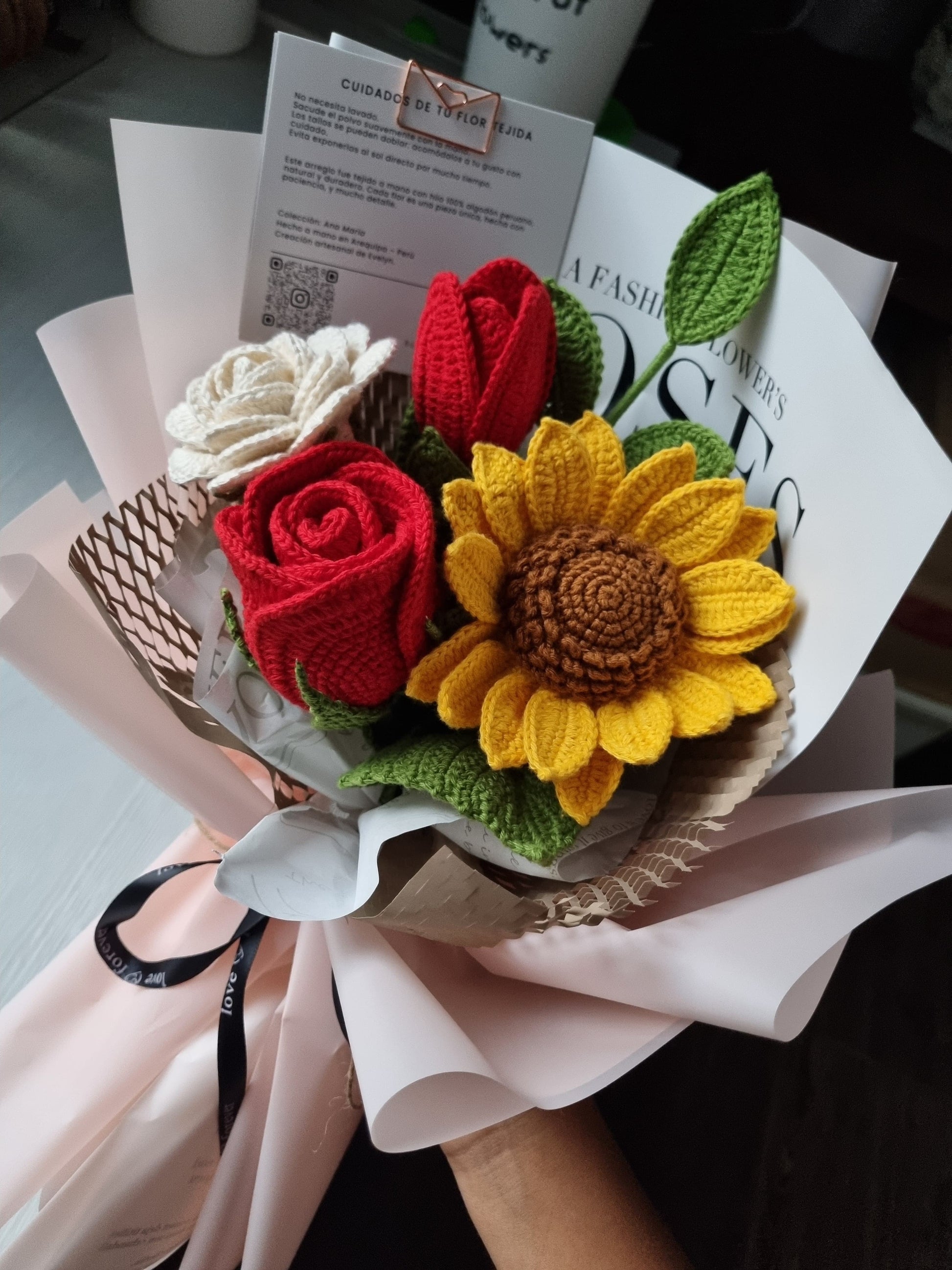 1 rosa roja tejida pétalo por pétalo, 1 girasol, 1 tulipán tejido pétalo por pétalo, 1 rosa, 1 rama de hojas verdes.