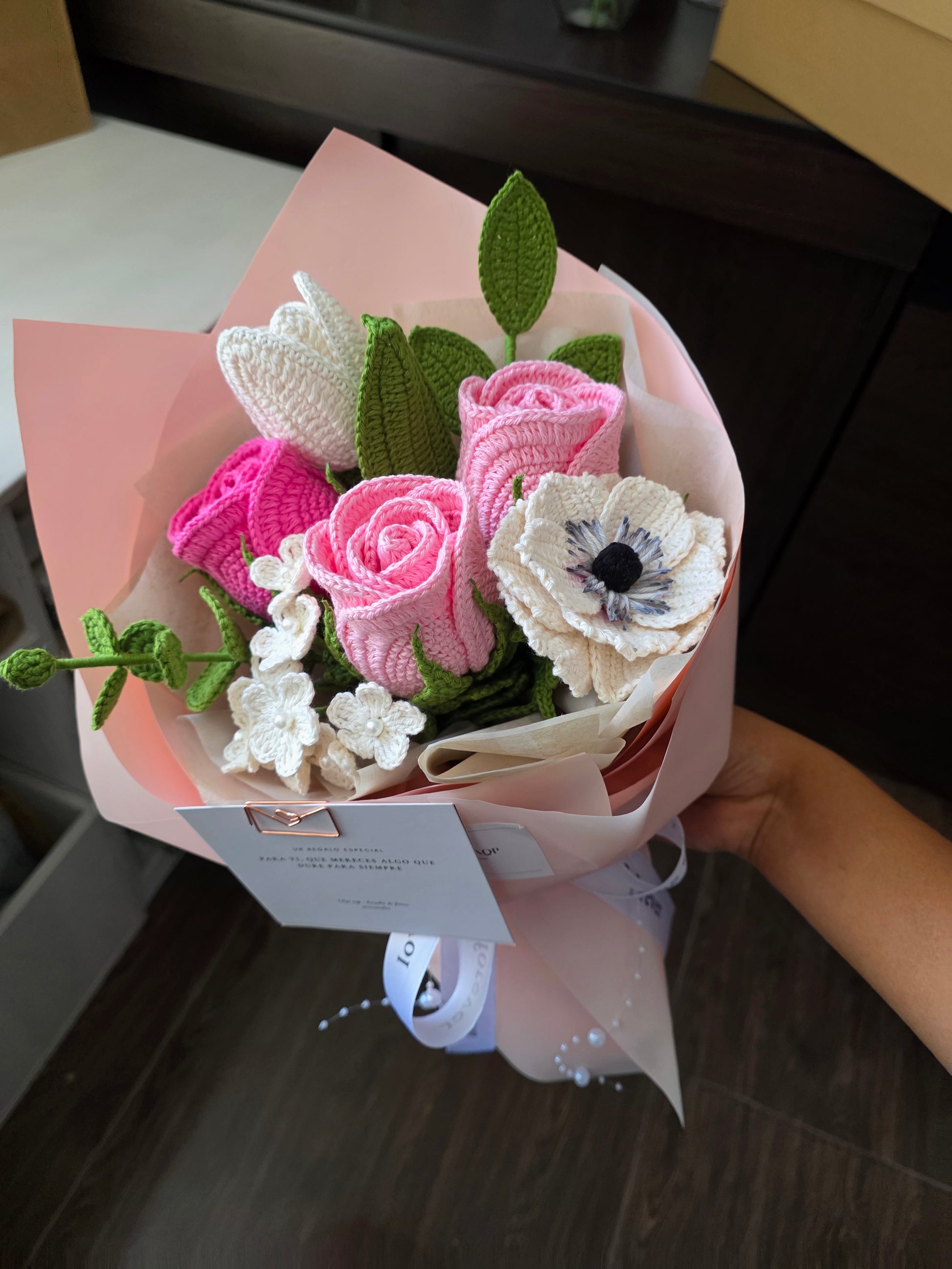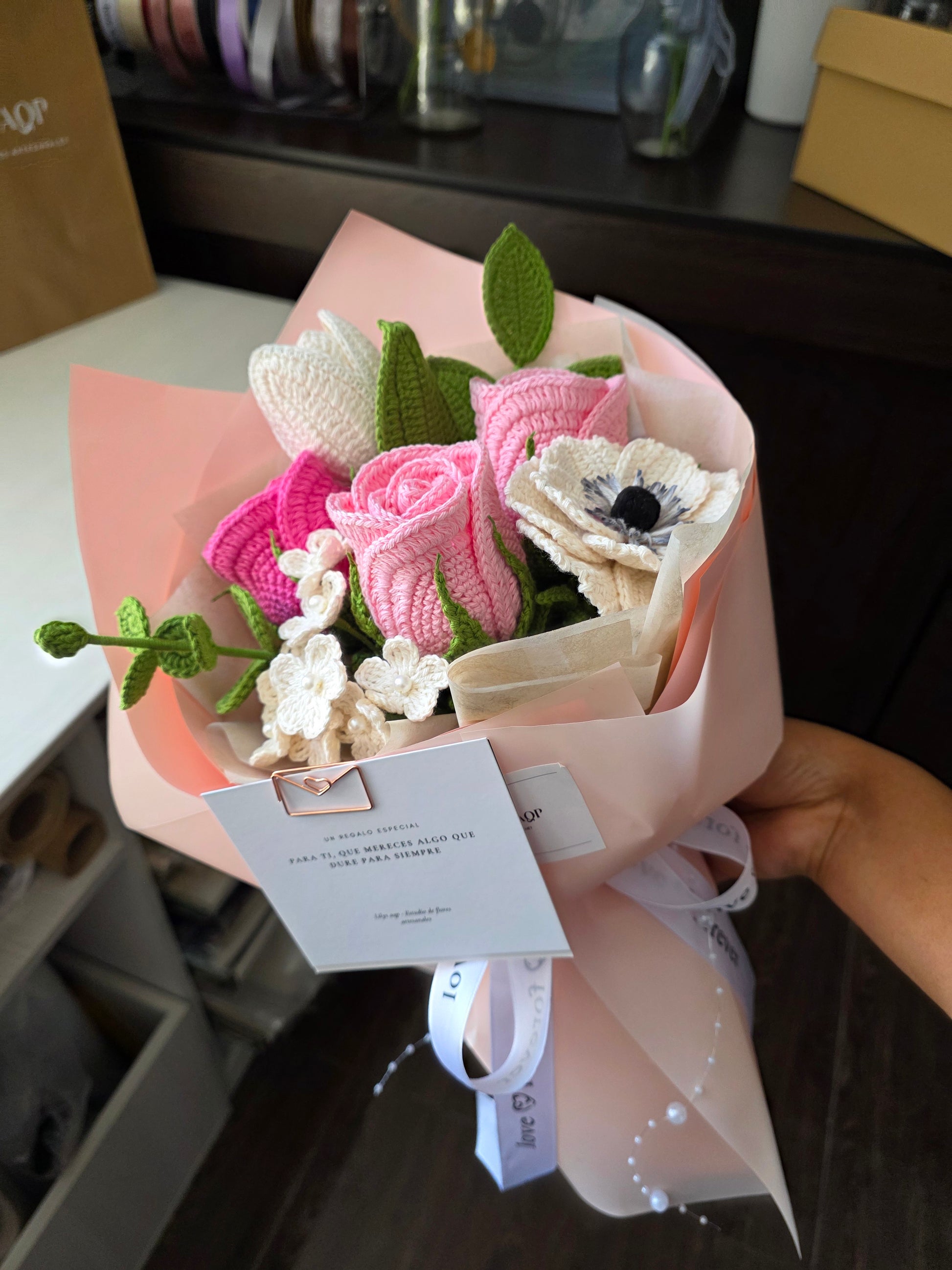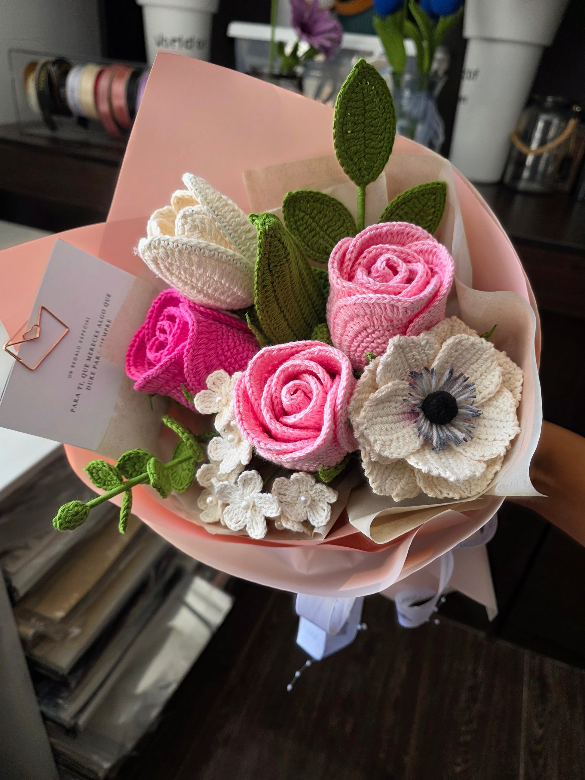1 tulipanes hoja por hoja, 3 rosas hoja por hoja, 1 anemona, 1 rama de eucalipto, 1 rama de hojas, 1 rama de no me olvides.