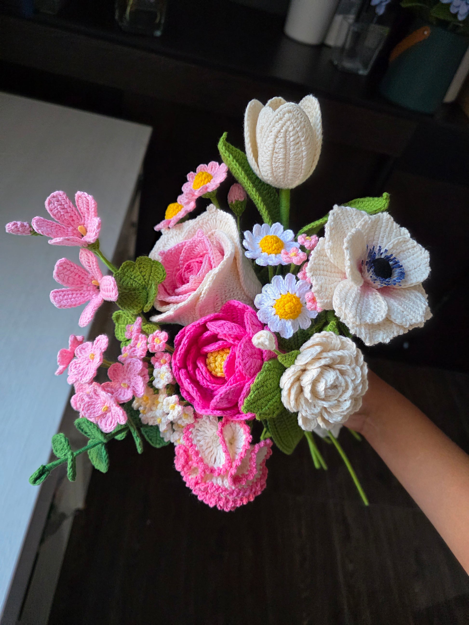 1 Anemona, 1 tulipán abierto, 1 peonia, 1 Jazmin gran duque, 1 rosa imperial, 1 clavel bicolor, 2 minimargaritas, 3 ramas de flores nube, 1 flores no me olvides, 1 eucalipto, 1 trebol.