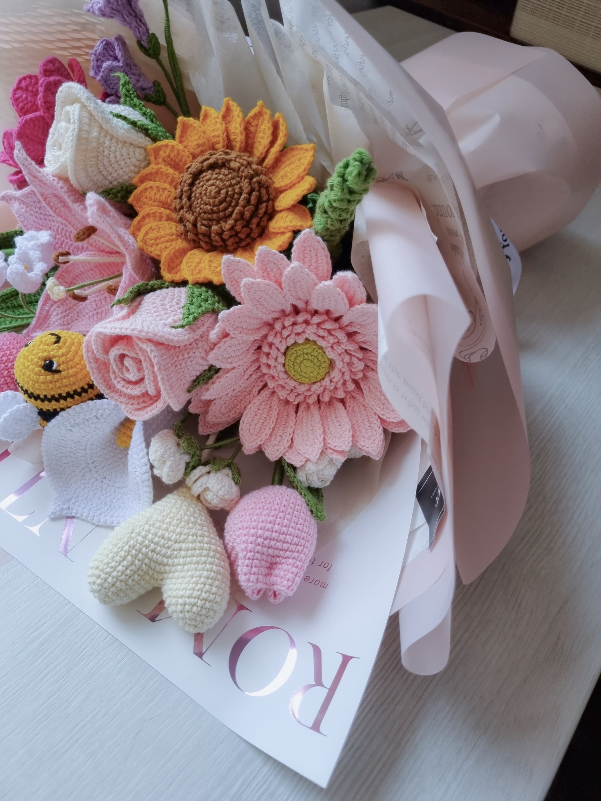 2 rosas pétalo por pétalo , 1 rosa, 3 tulipanes, 1 girasol, 1 lirio de cala, 1 lirio del valle, 1 peonia, 1 gerbera, 1 lirio, 1 abeja, 1 fresia, 1 corazón , 1 rama de minirosas, 1 lavanda.