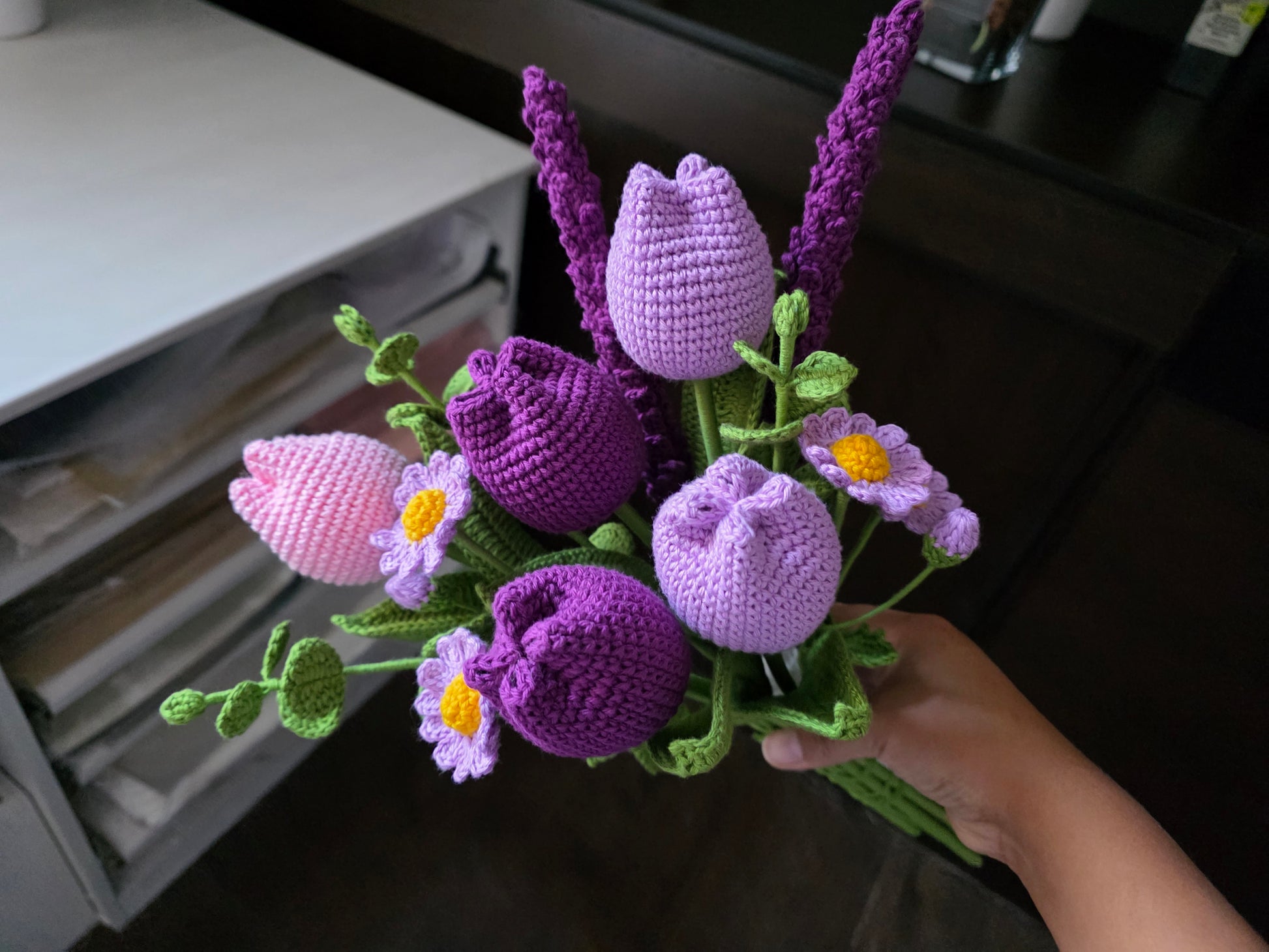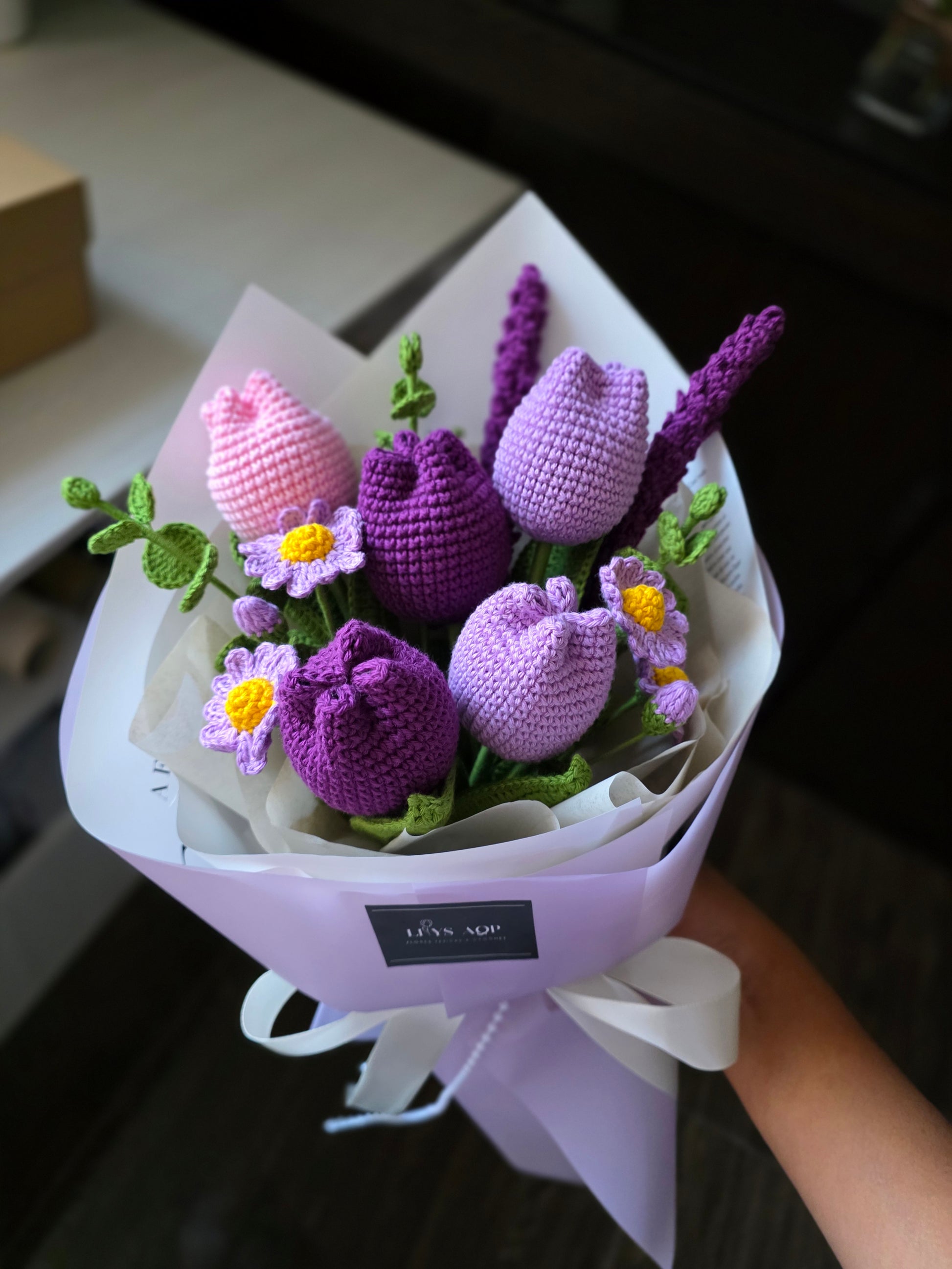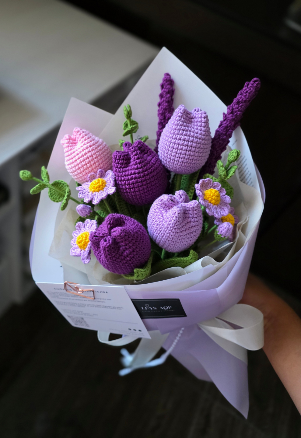 5 tulipanes cerrados, 3 ramas de eucalipto, 2 minimargaritas, 2 lavandas.